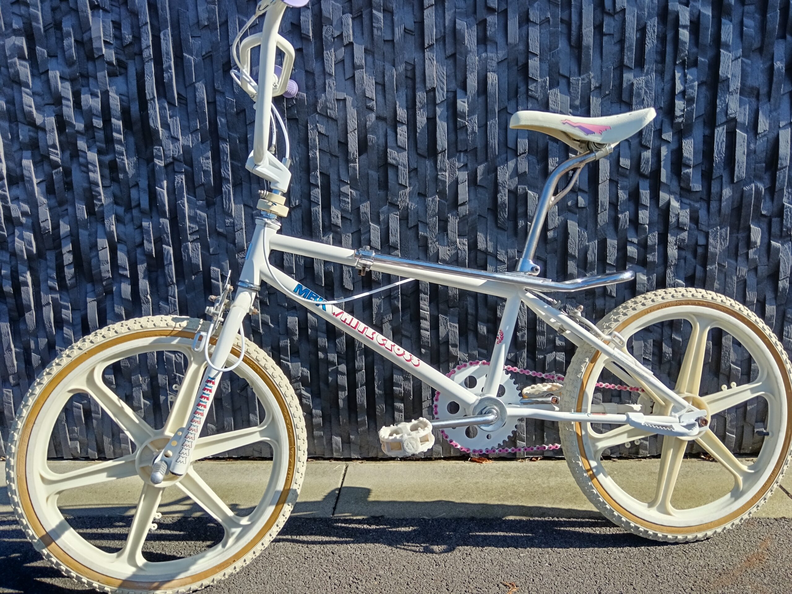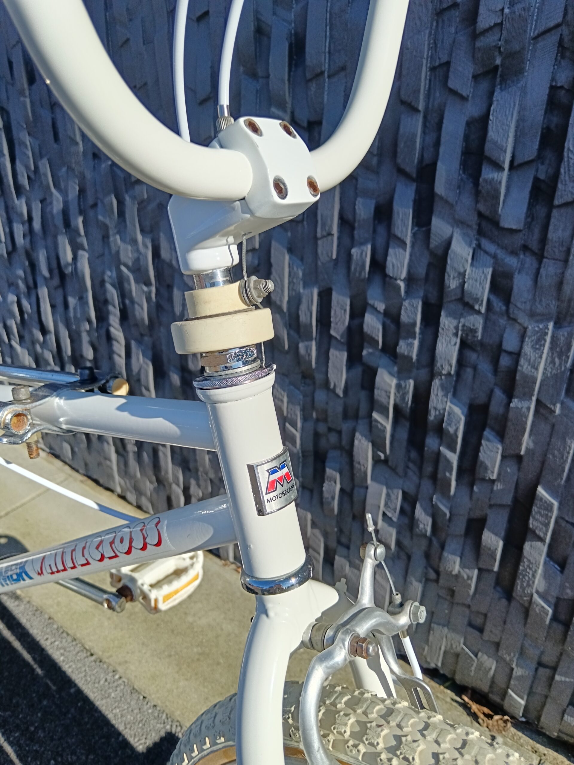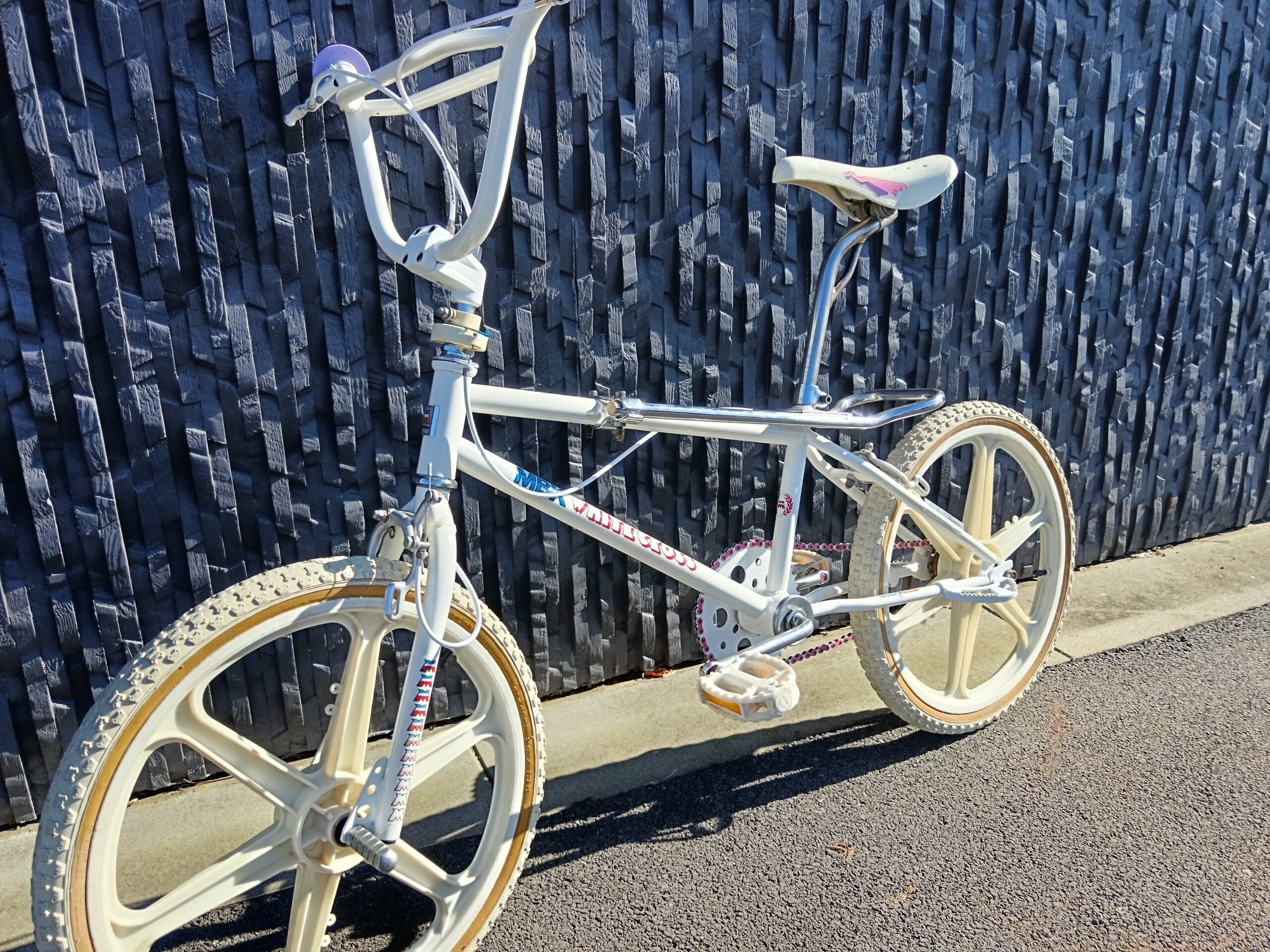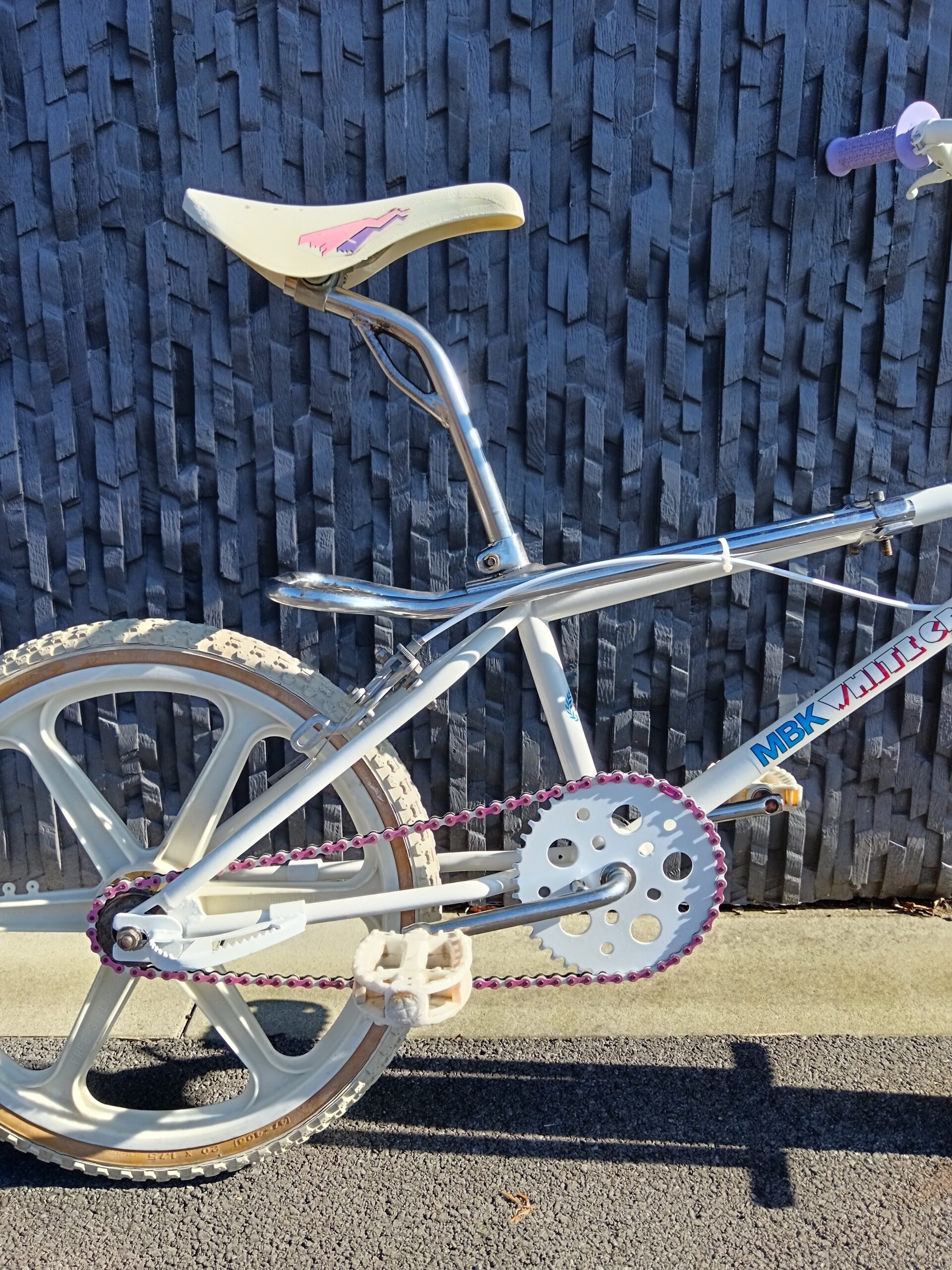 Bmx freestyle première génération. Quand les cadres iconiques made in California n’étaient pas encore très accessibles. Entièrement monté avec les composants disponibles dans le réseau Mbk de l’époque.