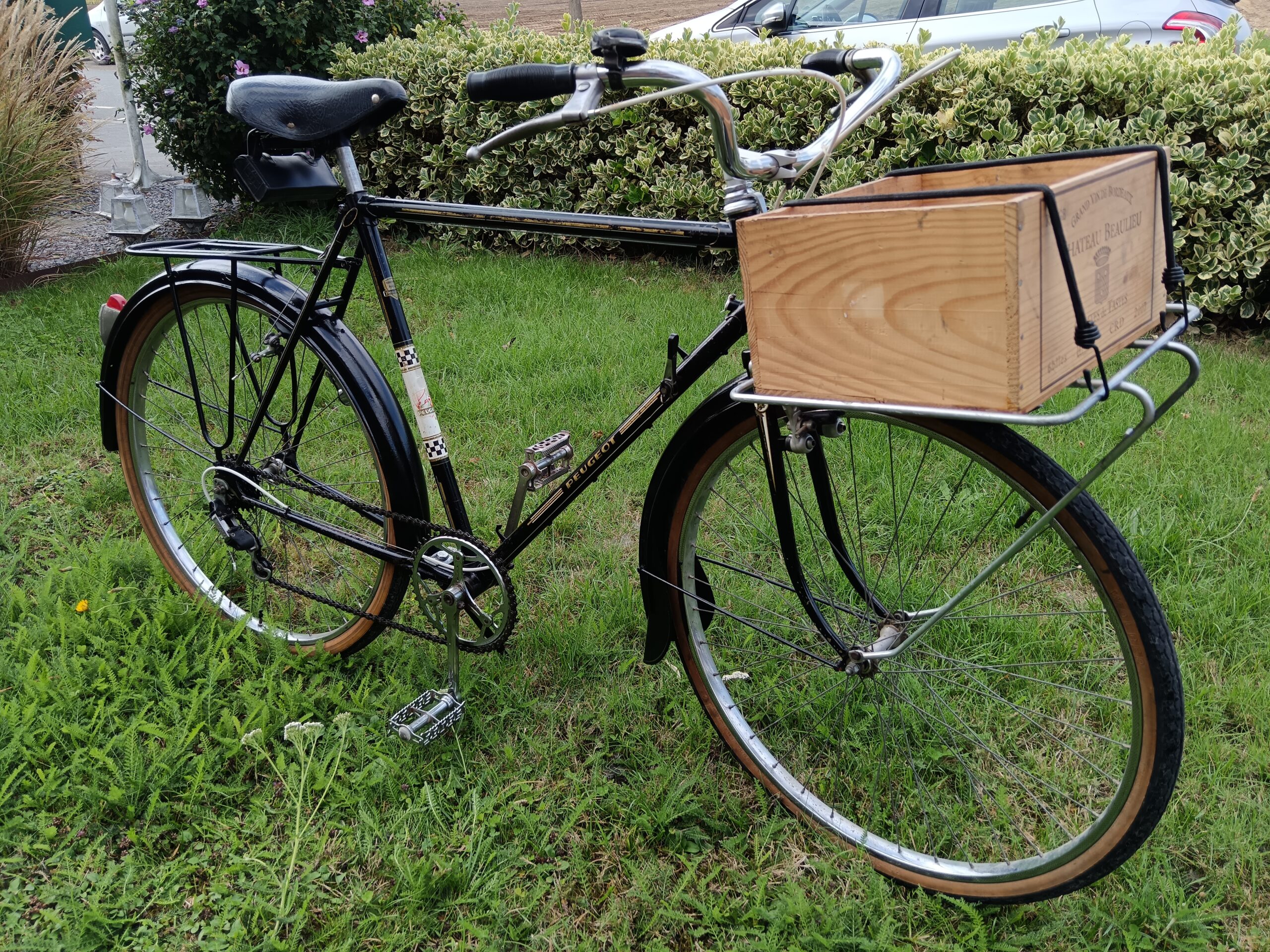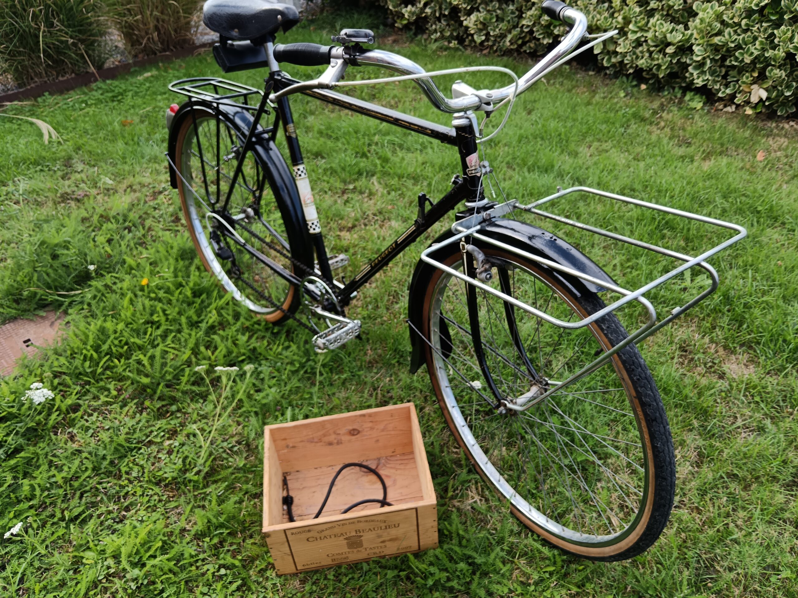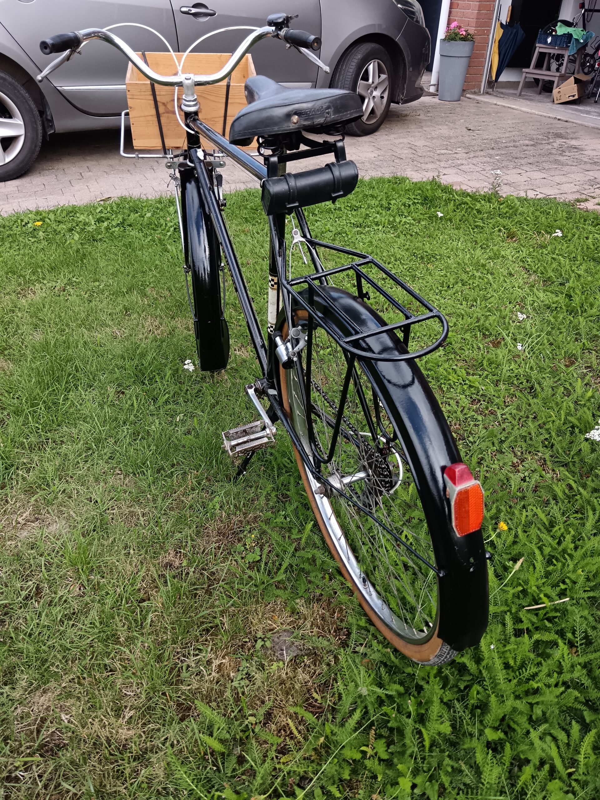 Vélo porteur ancien utilitaire avec porte paquet avant et porte bagage arrière, gardes boues, sonnette, sacoche outil…