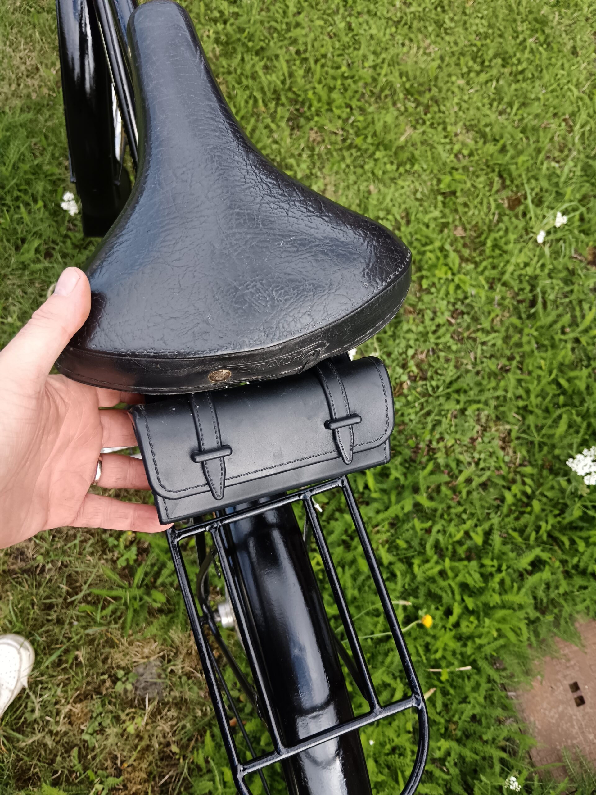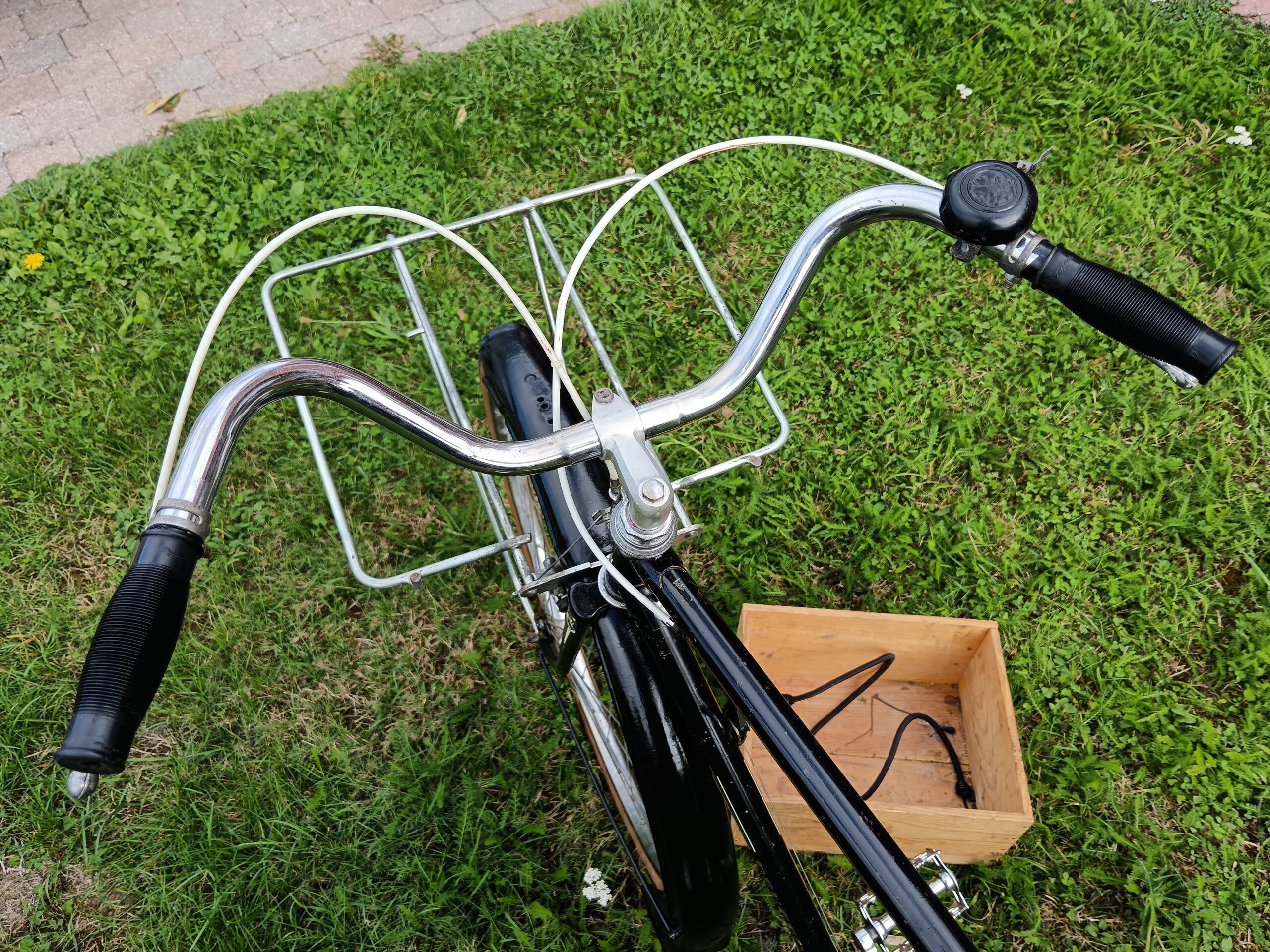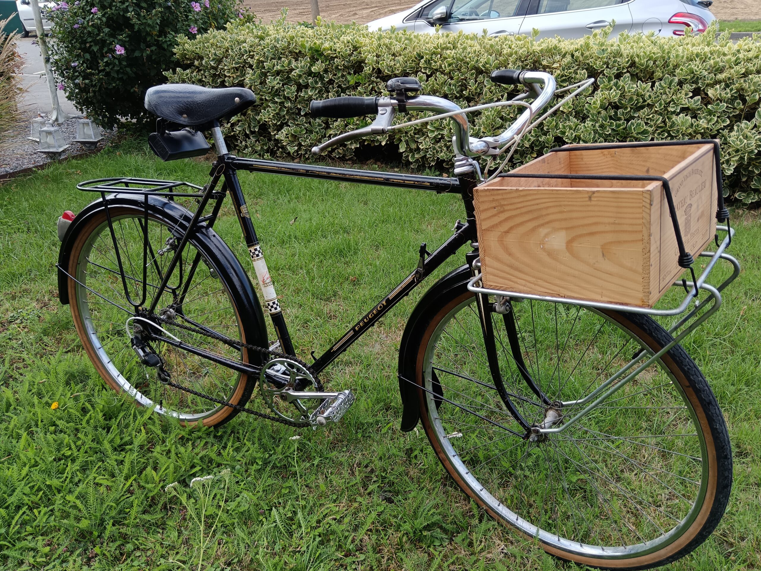 Vélo porteur ancien utilitaire avec porte paquet avant et porte bagage arrière, gardes boues, sonnette, sacoche outil…